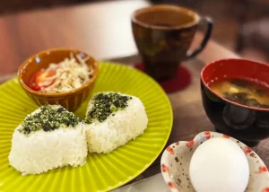 この日のモーニングは、ふんわりと握られたおにぎりに、彩り豊かな小鉢、具だくさんのお味噌汁、ゆで卵が添えられていました。